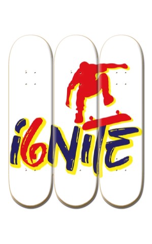 This product features three 8" skateboard decks that are lined up horizontally for you to create your design across all three decks continuously, and make a skateboard mural that can hang on your wall. Total Size: 32" x 24" Note: The 3 decks will be shipped together stacked (not fixed together). Hang them individually in any arrangement you like. *This is deck only, it does not include grip tape, hardware, trucks, or wheels